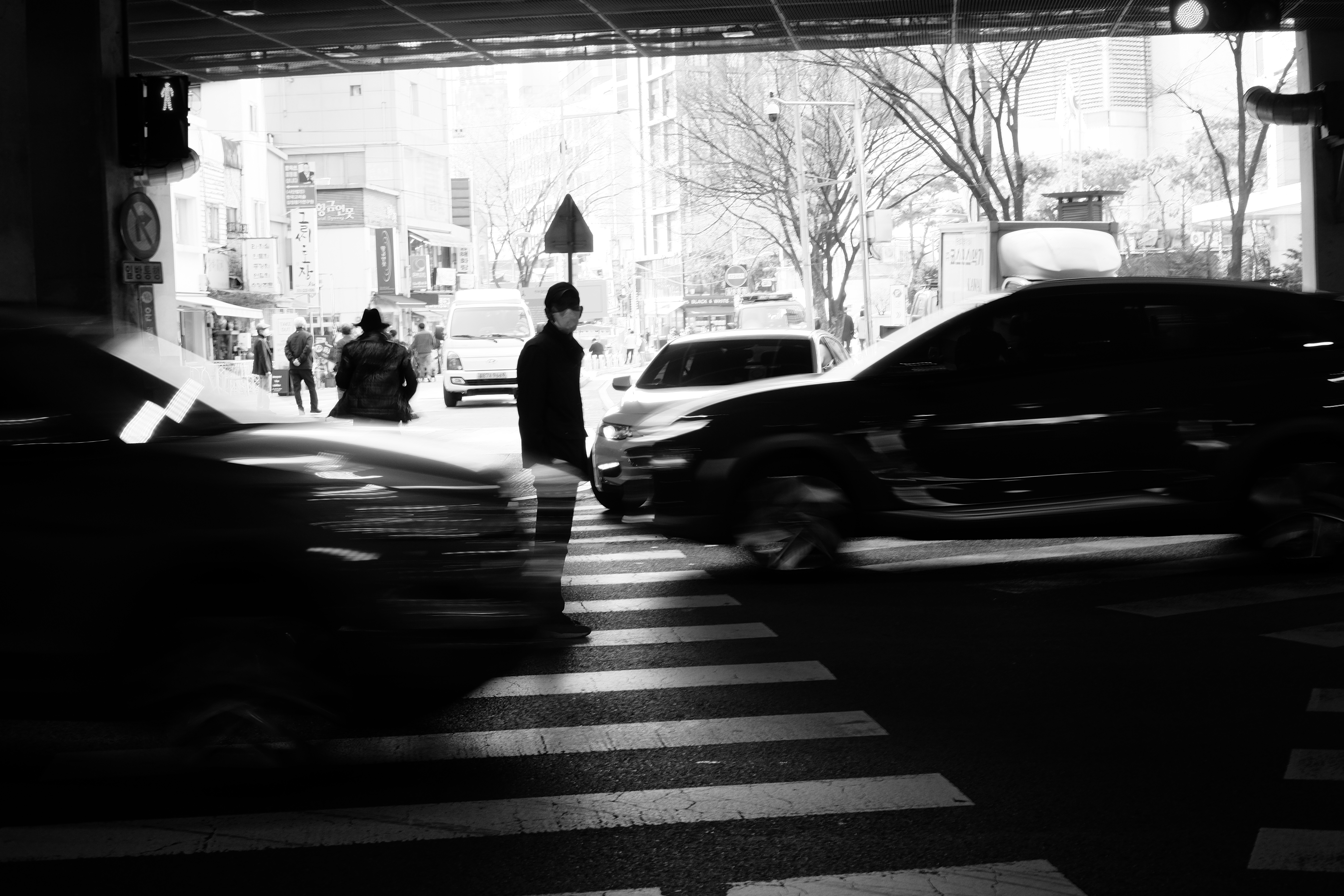 길을 건너기 위해 신호를 기다리던 중 할아버지 두 분이 횡단보도 사이에 있어 찍게 되었다. 한분은 이미 뒤에 달려가시는 중이고, 한분은 길 중간에 서 계셨다. 그때 촬영한 사진인데 분위기가 상당히 마음에 들어 아마 상반기 최고의 사진이 아닌가 싶다.
