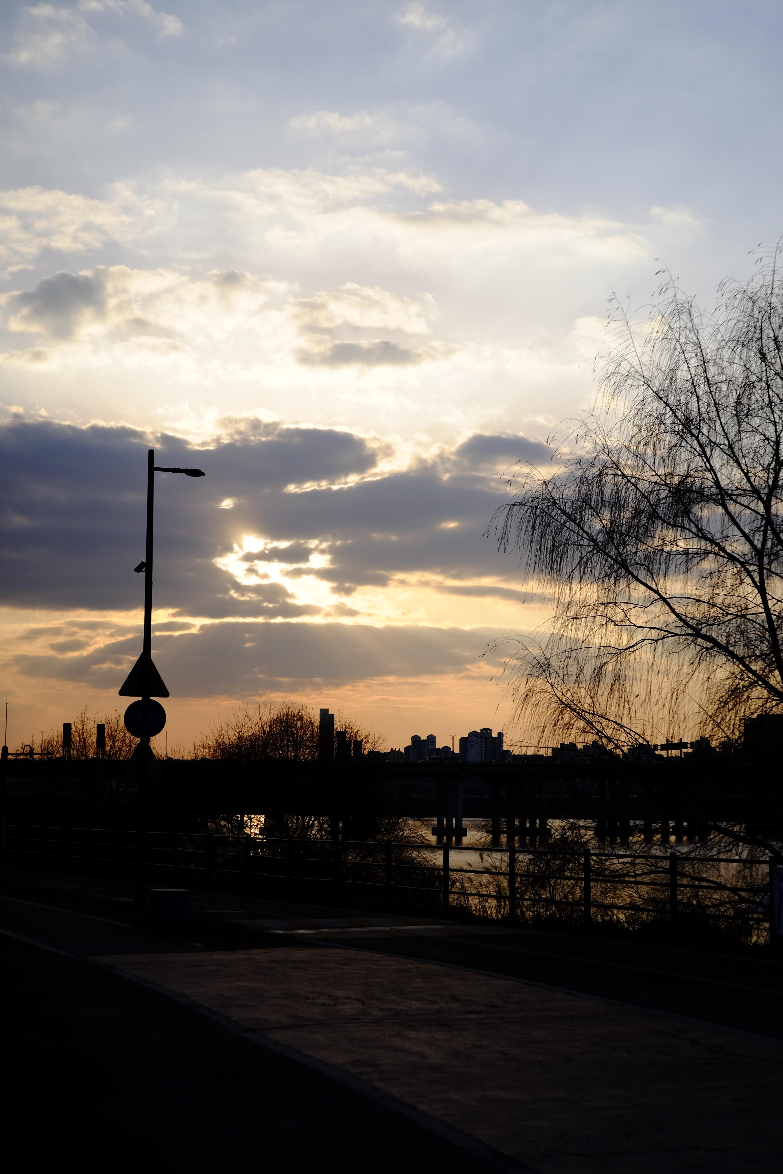 잠원한강공원의 노을. 한 번은 친구와 신사 쪽에 갔다가 한강공원에 들른 적이 있었다. 이때 찍어본 노을이다. 겨울이어서 그런지 나무도 앙상하고 찍은 사진들이 다 생기가 없다.