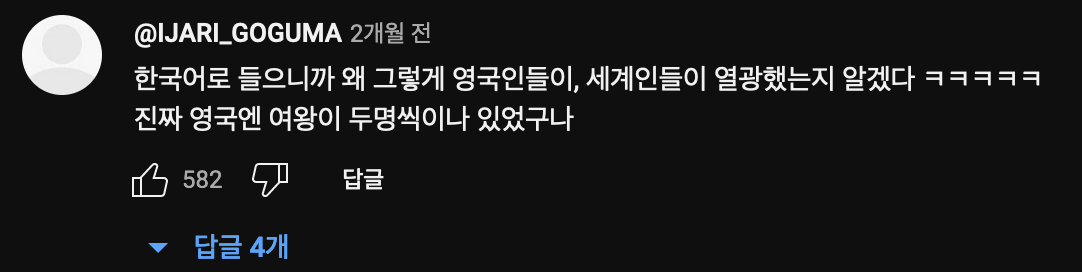 네 맘 가는 그대로 지금 내 손을 잡아그냥 내 손을 잡아 지금 내 손을 잡아아이유가 부른 '내 손을 잡아'를 프레디 머큐리의 목소리를 학습시켜 커버시킨 곡이다.최근 이런 AI를 이용한 커버곡이 쏟아지고 있는 가운데, 내가 들어본 AI 커버곡들 중 가장 노래와 음성이 잘 매치되는 곡이라 생각이 된다.댓글에도 나와 비슷하게 생각하는 사람들이 많은것 같다. 그 중 와닫고, 재밌는 댓글이 몇개가 있어 가져와 봤다.