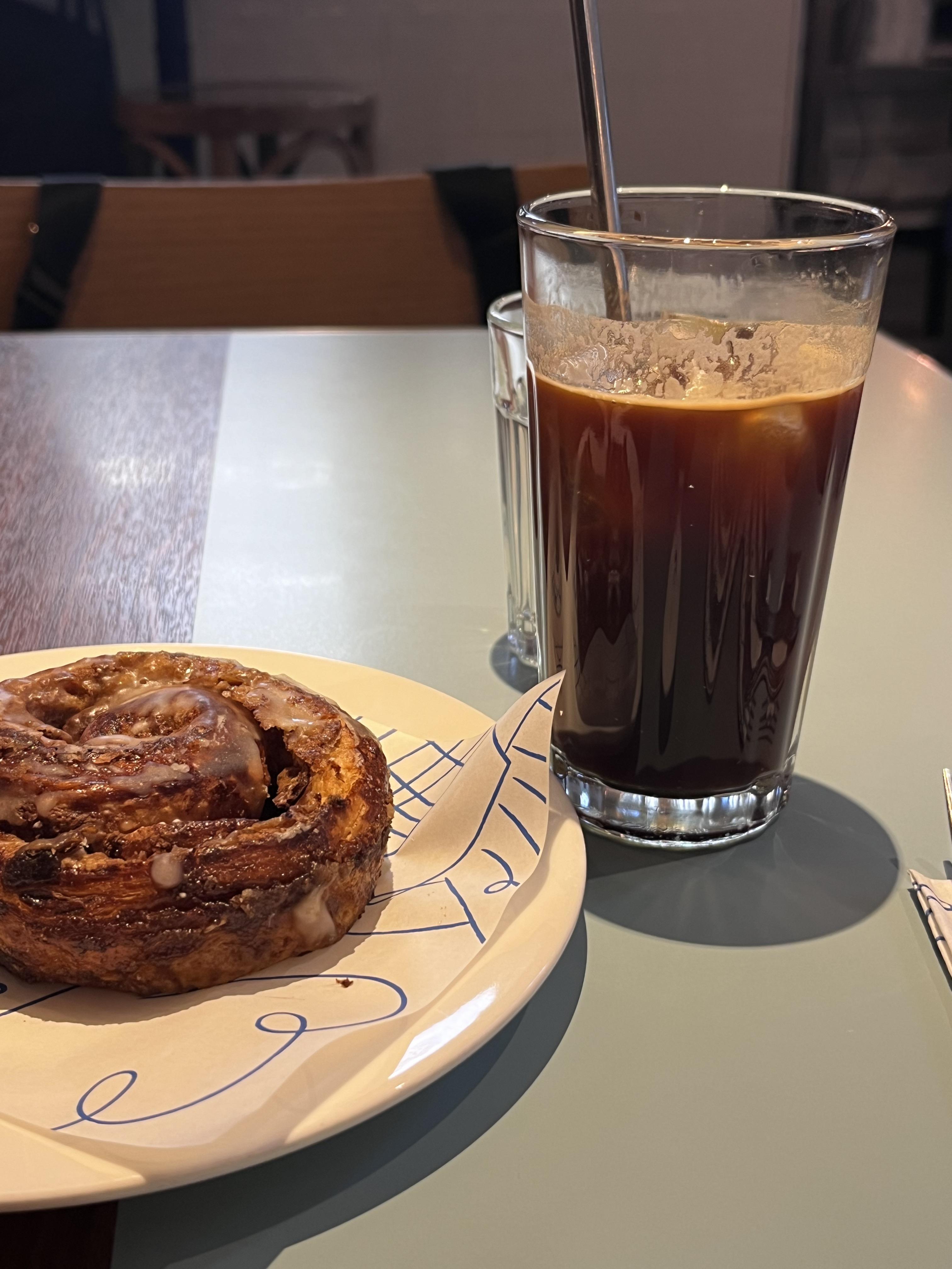 시나몬롤과 초코무스 그리고 아이스 아메리카노. 가보니 주방에서는 계속 빵을 만들고, 홀에서는 전형적인 베이커리 같은 모습으로 계속 빵을 팔고 있었다.