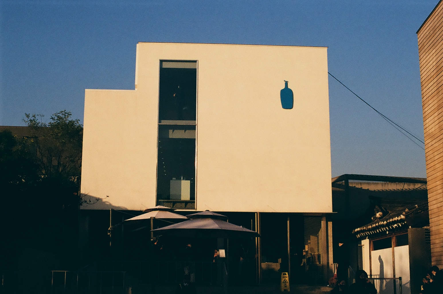 블루보틀 삼청. 필름을 갈아 낀 후 나와서 친구와 커피를 마시러 나갔다. 원래는 다른 곳으로 가려했는데, 가는 길에 블루보틀이 있어서 이곳으로 들어가 보았다. 1층은 주문을 받고 커피 용품(원두, 장비 등)을 판매하는 장소로만 사용되고, 2층부터 3층까지가 실제 고객들이 이용 가능한 공간이었다.
