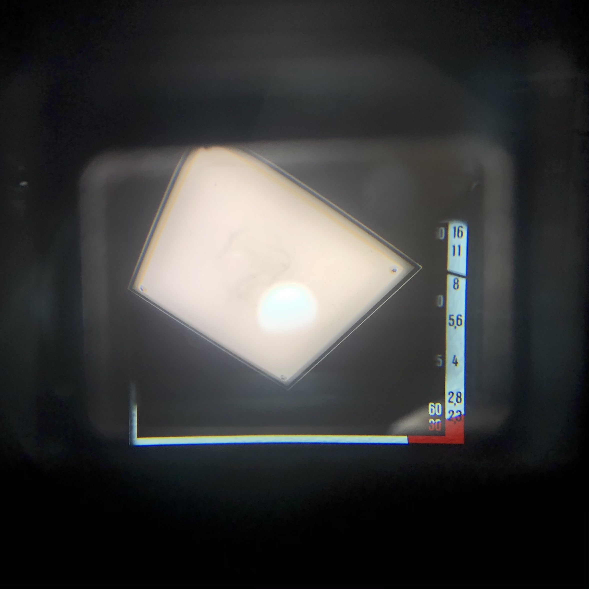 뷰파인더 내부. 마지막 하나로는 초점 만 맞춰주면 나머지는 카메라가 알아서 다 맞춰준다. 셔터스피드와 조리개를 주변 광량에 맞추어 자동으로 설정해준다. 왼쪽의 게이지가 현재 세팅값을 나타내며 빨간색 존에 바늘이 있는 경우 노출이 너무 낮다는 의미이다. 1974년에 발매된 카메라라는 점을 고려해보았을 때 매우 하이테크놀로지라 생각이 든다.
