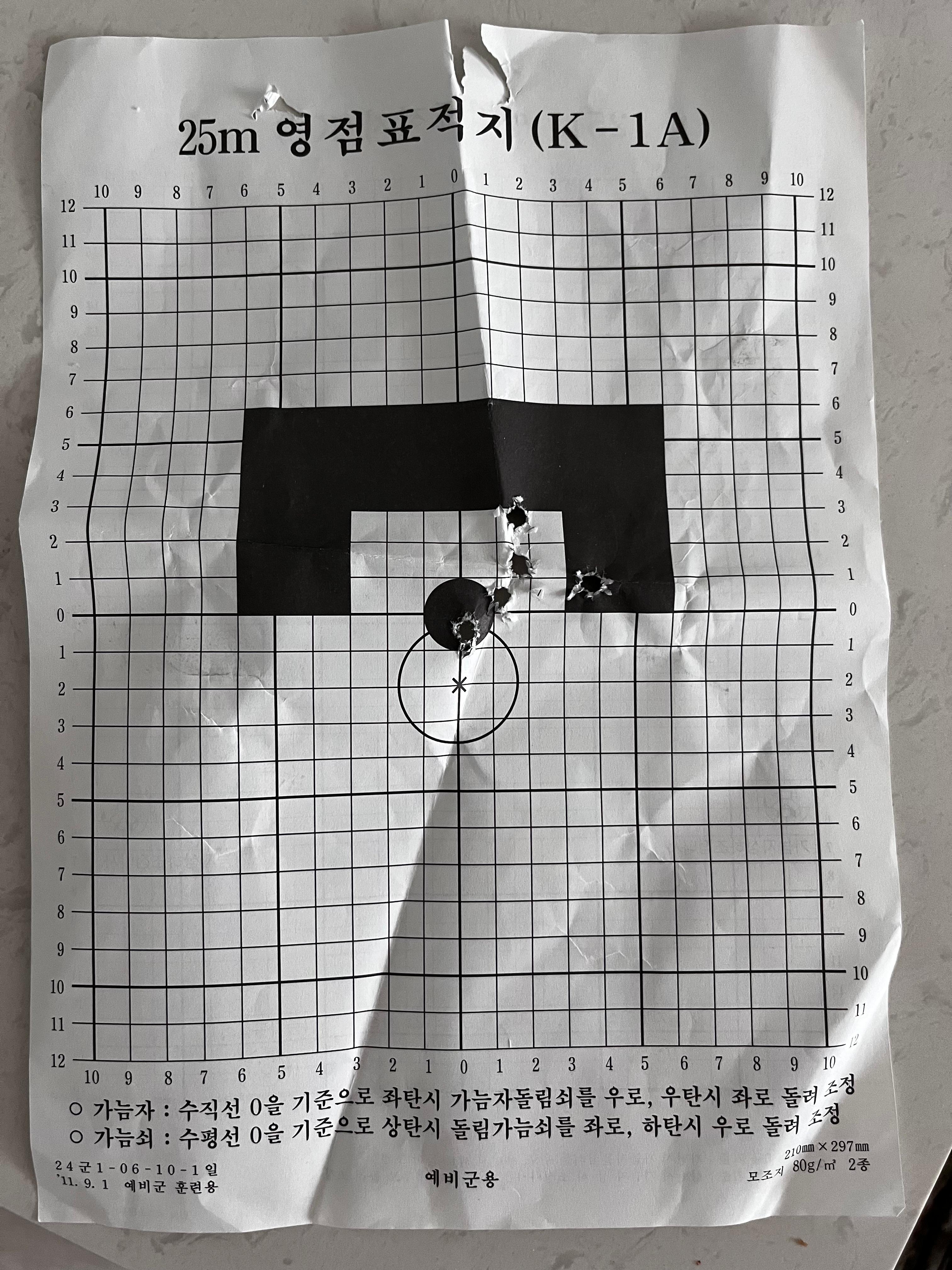 사진은 나름 사격 결과가 괜찮아, 결과 확인 후 종이를 폐기처분 한다길래 아쉬워서 가져왔었다. 사진 찍을 땐 손떨림 방지가 없으면 다 흔들려서 나오는데 이건 어떻게 맞췄는지 의문이다.